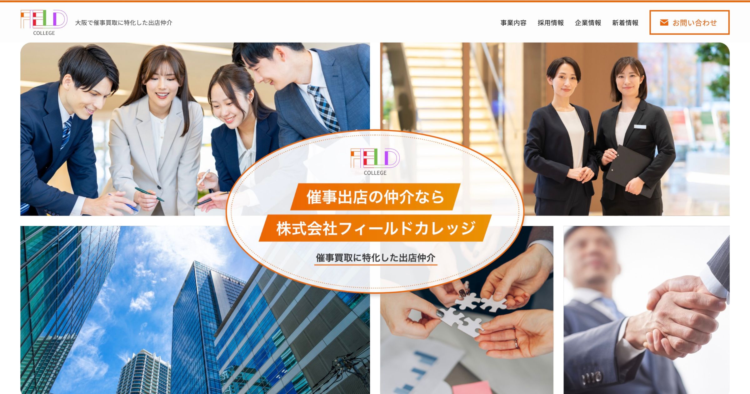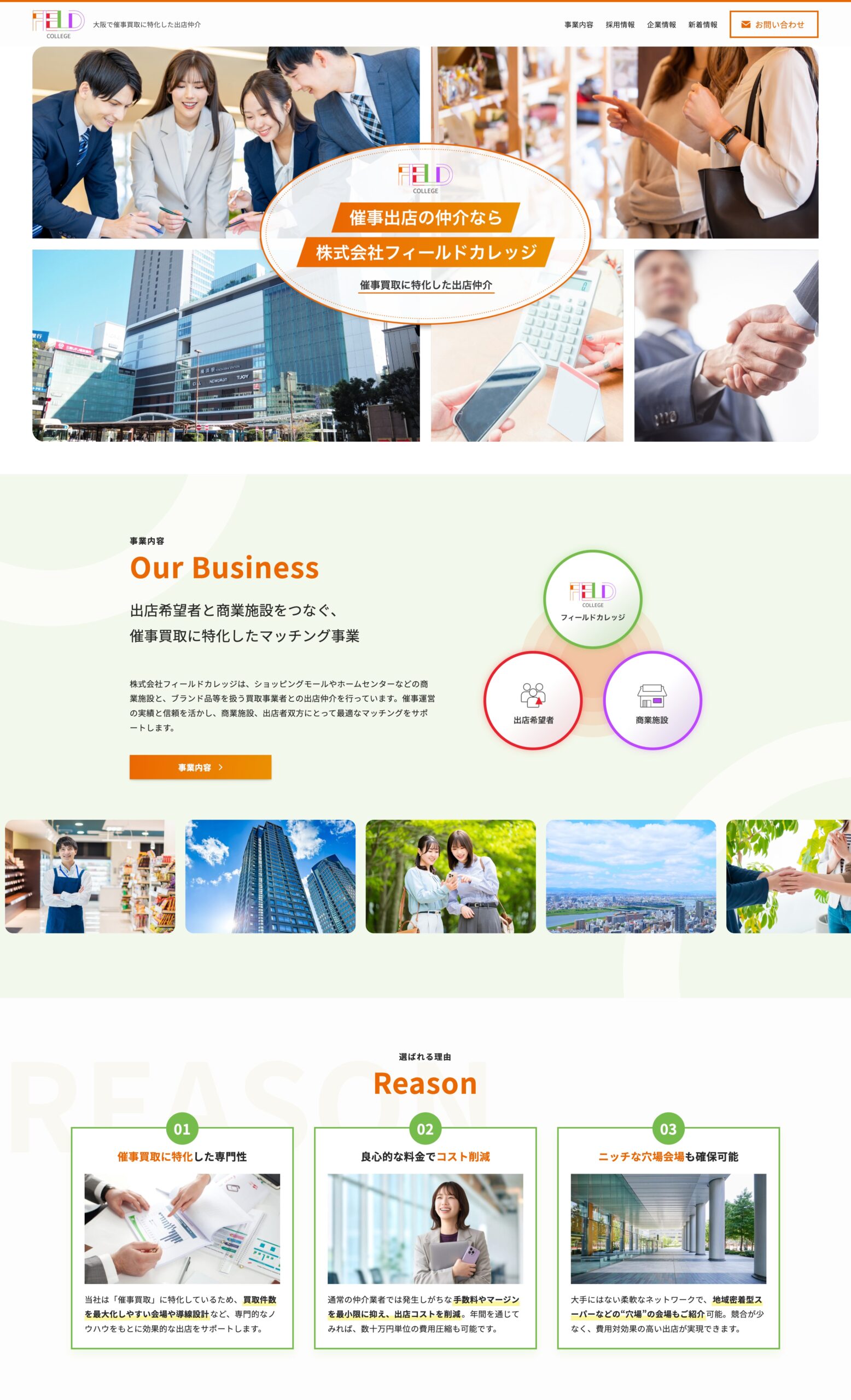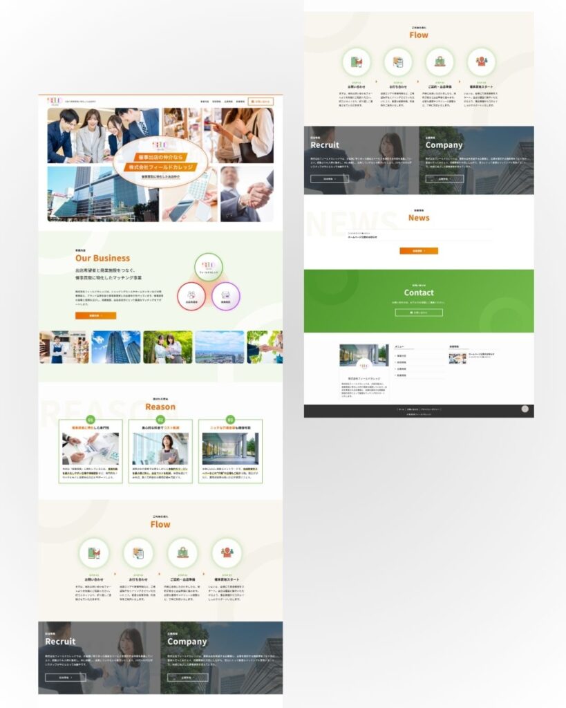 大阪を拠点に、商業施設での催事買取や出店仲介を専門に行っているフィールドカレッジ様。これまではご紹介中心でお仕事をされていましたが、さらなる事業拡大と企業の信頼性向上のため、初めて訪れる方にも「仲介のプロ」としての安心感が伝わるホームページを制作したいとご相談をいただきました。
