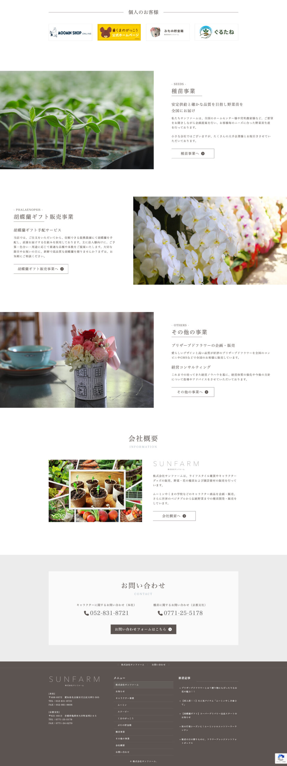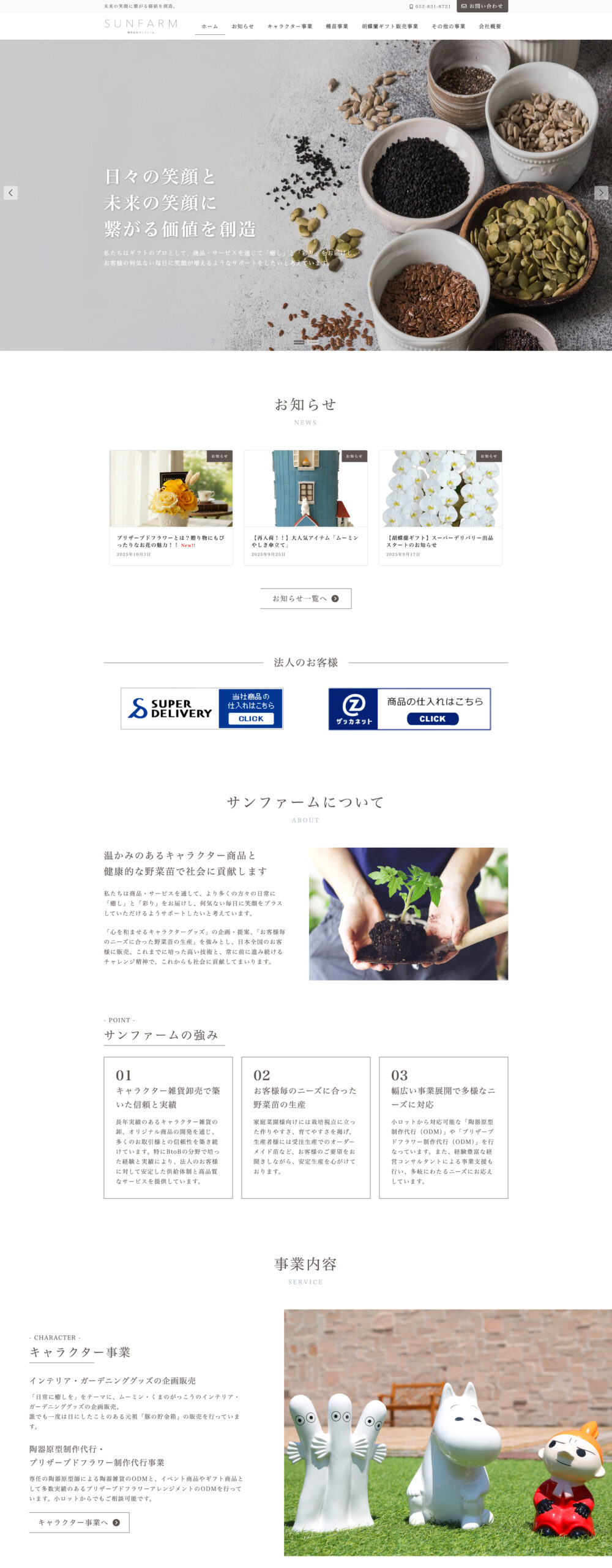 株式会社サンファーム様のホームページ制作を担当させていただきました。株式会社サンファーム様は、キャラクター雑貨の企画、種苗の育種・販売、フラワーギフトのODMや制作代行、陶器造形、さらには経営コンサルティングまで、多角的な事業を展開されている企業です。