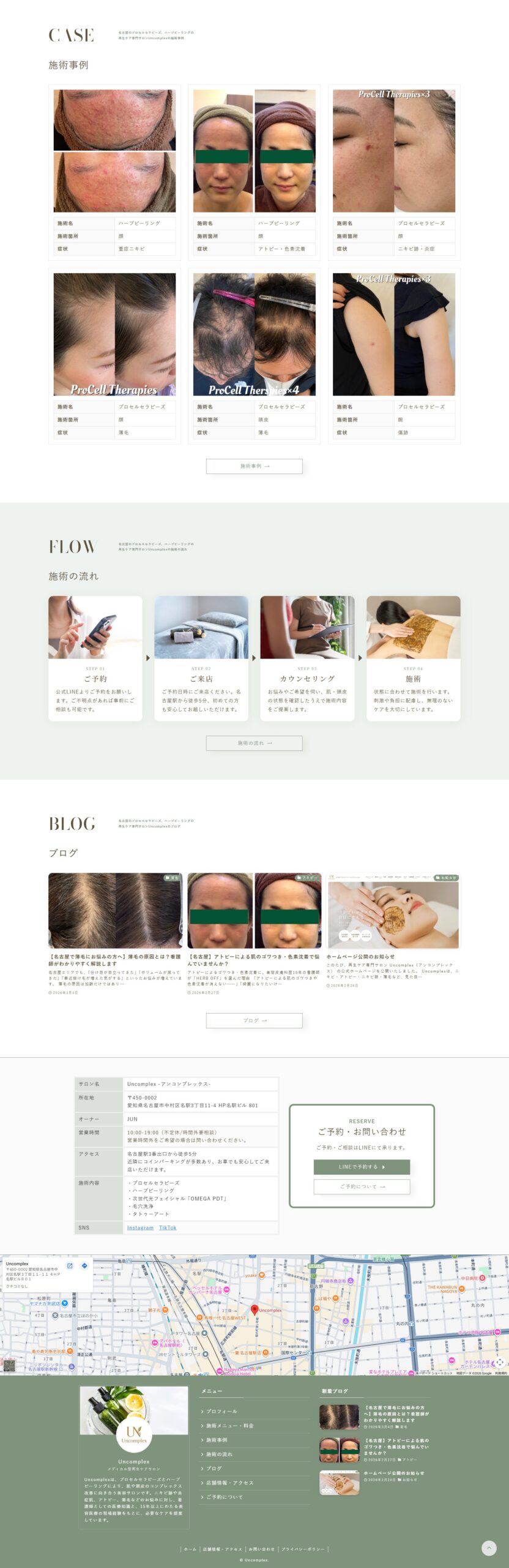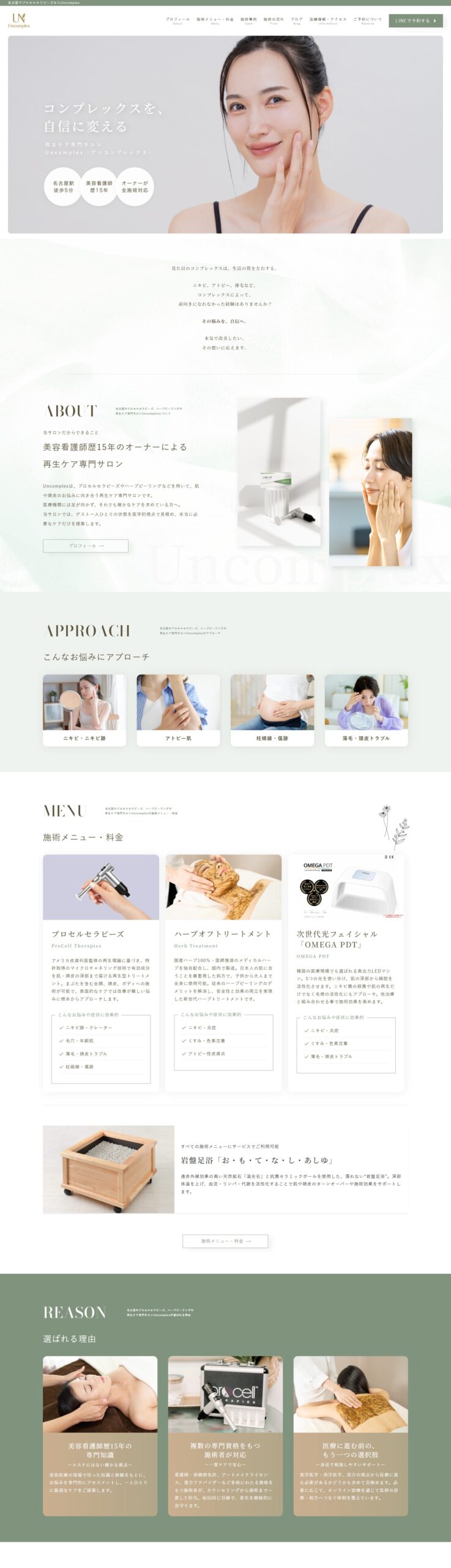 美容サロン「Uncomplex(アンコンプレックス)」様のホームページ制作を担当させていただきました。名古屋駅近くにある再生ケア専門サロンで、肌や身体のコンプレックスに寄り添いながら、一人ひとりの理想に向けたケアを提供されています。看護師・保健師の資格を持つオーナーが、美容ナースとして15年以上の経験を活かし、丁寧なカウンセリングと施術を行っている点が特徴です。